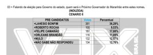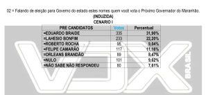 Segundo o levantamento, Braide aparece com 31,90% das intenções, seguido pelo ex-prefeito de São Pedro dos Crentes, Lahesio Bonfim, com 22,20%. Em terceiro lugar atual vice-governador Felipe Camarão, soma 11,16%; seguido pelo ex-senador Roberto Rocha, que registra 9,04% e Orleans Brandão aparece com 8,47%. A pesquisa também mostra que 9,62% dos entrevistados afirmaram que pretendem anular o voto, enquanto 7,61% disseram que ainda não sabem em quem votar ou preferiram não responder.