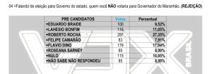 No quesito rejeição Roberto Rocha é o mais rejeitado com 27,35%. Na sequência aparece o ex-governador e atual ministro da Justiça, Flávio Dino, com 17,04% de rejeição. Já o ex-prefeito de São Pedro dos Crentes, Lahesio Bonfim, aparece com 11,05%, seguido de perto pelo prefeito de São Luís, Eduardo Braide, com 9,52%.Outros nomes citados foram o secretário de Educação Felipe Camarão, com 7,91%, e a ex-governadora Roseana Sarney, com 8,09%. A rejeição aos candidatos reflete também na opção por voto nulo, que foi apontada por 10,95% dos entrevistados, enquanto 8,09%disseram não saber ou não quiseram responder.