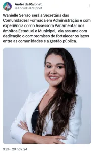 Trata-se de Wanielle Serrão que será a secretária das Comunidades.