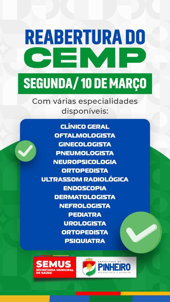 O Centro de Especialidades Médicas de Pinheiro CEMP, estará de volta com as suas atividades a partir da próxima segunda-feira dia 10.