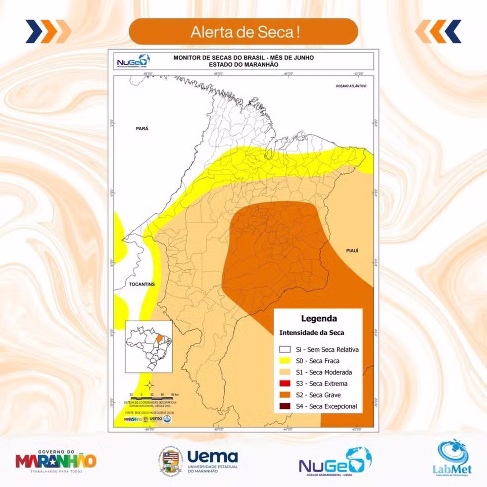 Setenta e oito municípios do Maranhão estão em alerta devido à seca grave, segundo levantamento do Núcleo Geoambiental da Universidade Estadual do Maranhão (UEMA). Os dados, baseados no Monitor de Secas, classificam essas localidades no nível S2, categoria que representa impactos significativos na agricultura e no abastecimento de água.