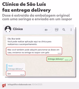 Na clínica de São Luís, a entrega do Mounjaro é delivery. Por WhatsApp, sem saber que falava com uma jornalista, a atendente explicou que o medicamento é extraído da embalagem original com uma seringa, e entregue em um isopor com gelo.