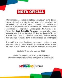 “Após avaliações positivas em torno de seu estado de saúde e diante das respostas favoráveis ao tratamento, já iniciado para combater um linfoma na medula, o ex-governador e secretário de Desenvolvimento Econômico e Programas Estratégicos do Governo do Maranhão, José Reinaldo Tavares, recebeu alta nesta segunda-feira (15), do hospital DF Star, da Rede D’OR, em Brasília, para que a segunda fase dos procedimentos médicos seja realizada sem a necessidade de internação”, diz a nota divulgada pela assessoria da Sedepe. Veja abaixo: